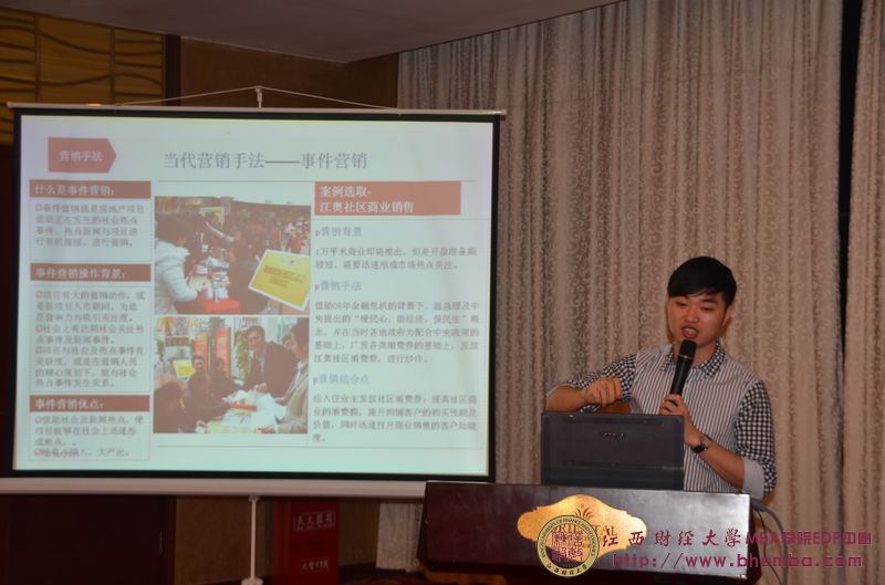 (年輕的胡僑同學(xué)在臺上侃侃而談,分享自己的房地產(chǎn)營銷理念)