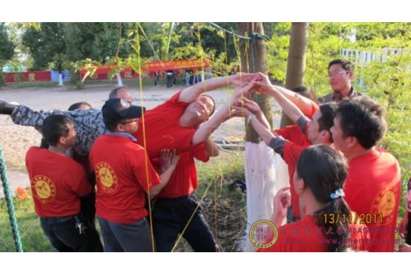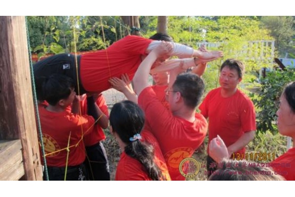 “背摔”,這是拓展訓(xùn)練中最具典型意義的項(xiàng)目之一。當(dāng)人站在1.4米的跳臺(tái)上直挺挺地向后倒下的時(shí)候,在臺(tái)下方的同事會(huì)用手托起成一個(gè)“人床”把臺(tái)上摔下的人接住。不少隊(duì)友出于本能的恐懼,在后倒時(shí)心理上出現(xiàn)猶豫,弓起身子,屁股先下去,這樣在下面接的同伴承受的局部重力過大,容易導(dǎo)致傷害。