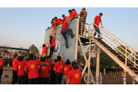 每個(gè)人都要翻越一堵大約4米且垂直的圍墻,這又是一個(gè)必須依靠集體的力量才能完成的項(xiàng)目。剛開始,大家都認(rèn)為這是很難完成而且比較危險(xiǎn)的任務(wù),估計(jì)需要半個(gè)小時(shí),甚至一個(gè)小時(shí)才能全部通過。