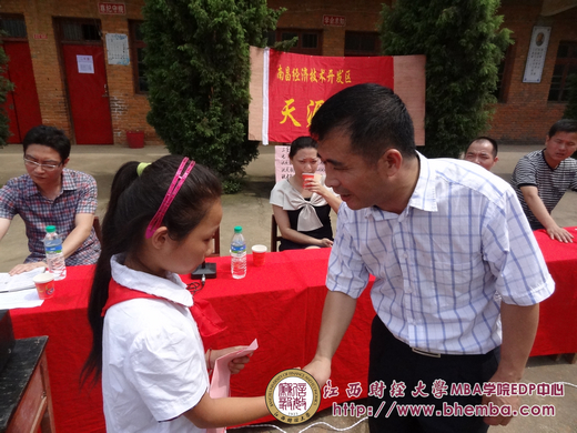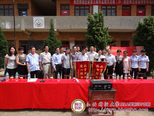 接下來是設備財物交接儀式和學校為企業(yè)家學員們頒發(fā)致謝錦旗。財大總裁26班對天源小學的慈善捐助活動在溫馨的大合影中結(jié)束。