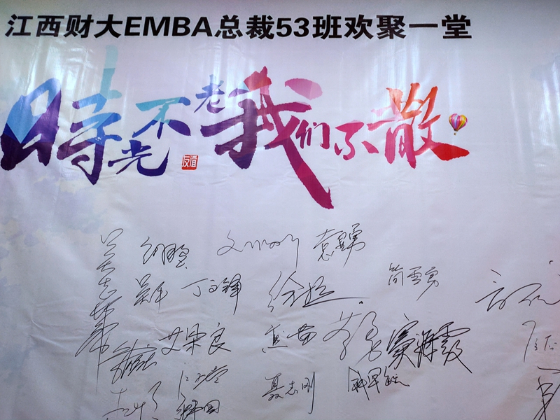 時(shí)光荏苒,歲月如梭;流年易逝,唯心不變! 轉(zhuǎn)眼間,江西財(cái)經(jīng)大學(xué)EMBA總裁53班班級(jí)成立已經(jīng)四年多了,回想在校學(xué)習(xí)的時(shí)光,那發(fā)生的點(diǎn)點(diǎn)滴滴,還宛如昨日,歷歷在目。10月26日,天空下著蒙蒙細(xì)雨,秋意正濃,余干縣黃金埠一里小溪風(fēng)情旅游小鎮(zhèn)格外的清麗迷人,山水閑堂民宿酒店掛好了歡迎橫幅,熱情期待著同學(xué)們?cè)琰c(diǎn)到達(dá)。下午將至,近30位同學(xué)陸陸續(xù)續(xù)從各地趕來(lái),5點(diǎn)30左右大家依次進(jìn)入山水閑堂,在簽名墻留下自己的名字,走過(guò)紅地毯,步入宴會(huì)廳,大家揮手相迎、互相寒暄、聊工作、聊生活、開玩笑,同學(xué)們相談甚歡,感覺(jué)有聊不完的話題。晚會(huì)在金牌主持人許民樂(lè)的點(diǎn)名聲中正式開始,并隆重介紹了每一位到場(chǎng)同學(xué),讓大家重溫課堂時(shí)光。 接下來(lái)此次聚會(huì)東道主段巖同學(xué)致歡迎辭,對(duì)大家的到來(lái)既期盼又激動(dòng),整整一個(gè)多星期,心里想的、嘴上念的都是同學(xué)聚會(huì),回憶學(xué)習(xí)時(shí)的一個(gè)個(gè)故事,從入學(xué)到畢業(yè),一起游學(xué)澳洲、韓國(guó)、泰國(guó),好多個(gè)春夏秋冬,好多人瞬間眼淚打濕了眼眶。是的,多年之后,是誰(shuí)仍珍藏著你的照片,是誰(shuí)還時(shí)常把你惦念! 在同學(xué)們的呼吁聲中艾梁良班長(zhǎng)發(fā)表致辭,沒(méi)想到時(shí)隔這么久,一個(gè)短信/一個(gè)電話/一個(gè)發(fā)聲,這么短的時(shí)間同學(xué)能聚這么齊,看到很多同學(xué)變化很大,事業(yè)發(fā)展越來(lái)越好,由衷的感到驕傲、自豪! 晚會(huì)上除了佳肴還精心準(zhǔn)備了豐富多彩的節(jié)目,有主持人許民樂(lè)優(yōu)美暢然的詩(shī)朗誦——舒婷的《致橡樹》,有特邀嘉賓魯文智粗獷動(dòng)聽的演唱——《好好學(xué)習(xí)、天天向上》《當(dāng)我想起》,還有鐘軍毓、丁文峰等同學(xué)的即興表演,將晚會(huì)推向了高潮。此次的相聚,像封存了多年的清酒,揭開滿是香醇! 四方同心,一路前行。“同學(xué)”,這再平常不過(guò)的卻是最美的開頭,天涯海角,都會(huì)記得這份深情厚誼!在山水閑堂休閑雅致的環(huán)境中,同學(xué)們回憶了以往的歡笑,也憧憬了美好的未來(lái)。一個(gè)人做事難,但是一個(gè)團(tuán)隊(duì)就不難,相信在總裁53班這個(gè)團(tuán)隊(duì)里、在江西財(cái)大EMBA總裁班這個(gè)平臺(tái)的賦能支持下,53班的同學(xué)們必將砥礪向前、拼搏奮起!